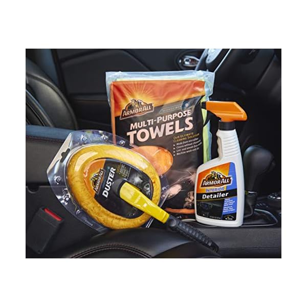 Grab the Armor All Car Interior Cleaner Bundle to help keep your car’s interior looking like new. This auto detailer bundle includes microfiber towels, an interior duster and Armor All Interior Detailer Spray. Scientifically engineered to restore and reveal the natural appearance of vehicle surfaces, this interior detailer spray is a multi-surface cleaner with a non-greasy, residue-free formula. Spray it on any interior car surface and wipe using a soft cloth. Pair this interior car cleaner with an Armor All Microfiber Towel for lint and streak-free results. These multi purpose towels are machine washable for easy care. Crafted with microfibers, the Armor All Car Duster lifts dirt off dry surfaces with a soft, gentle dusting surface that’s scratch free. When it gets dirty, remove the end from the handle and wash it by hand or in the washing machine. Keep this car care kit handy to freshen up your vehicle interior at home.