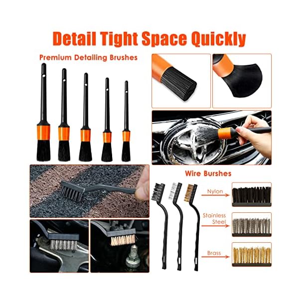ALL- ROUND DETAIL YOUR CAR WITH EASE – Newly upgraded pink car cleaning gel has strong adsorption power and can be used in conjunction with a duster to remove dust on the surface of the car. 5 different size premium detailing brushes can get into all the little cracks, the nooks, the lug nuts or tight space. The wire brushes are made of brass, stainless steel and nylon, hard enough to get clean rust and detail completely. Full range clean up and take care of your car.
