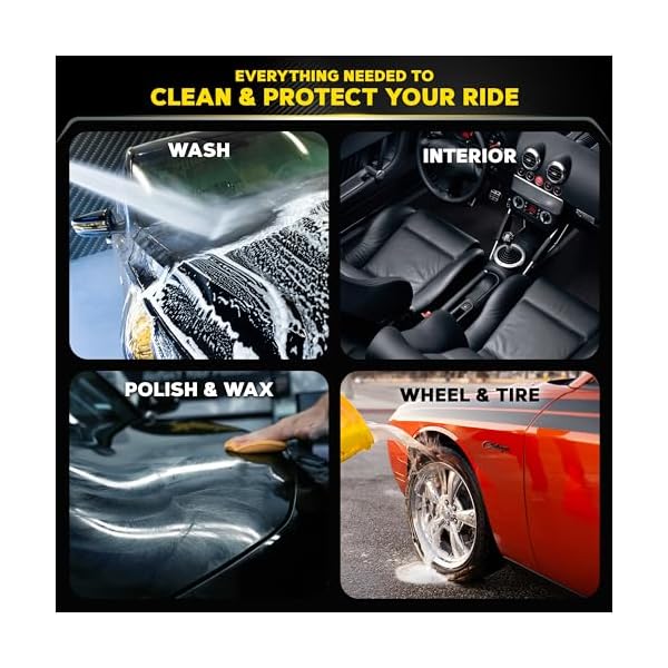 BEST CAR WASH KIT: This complete 8-piece car wash and wax kit is loaded with premium quality products to keep your car looking great inside and out, including cleaning and conditioning agents for your wheels, tires, exterior and interior surfaces.
