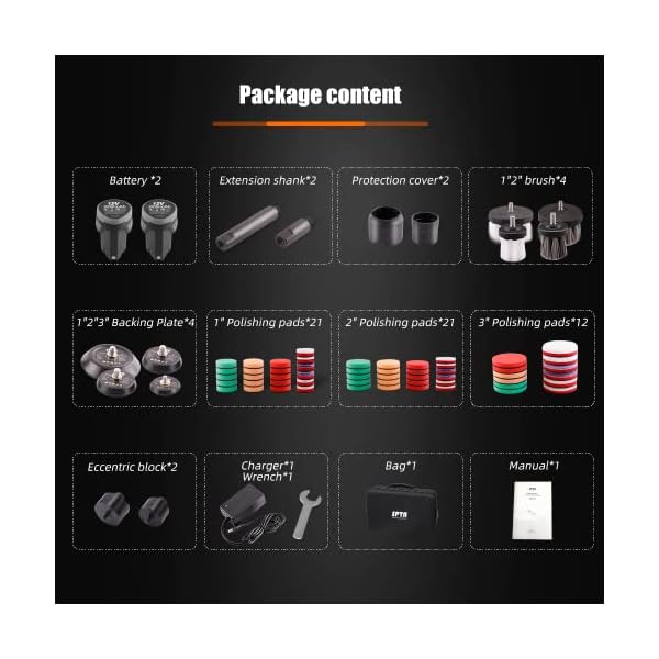 Our mini car polisher is easy to use, which is not only suitable for polishing professionals but also for beginners. When you buy our mini car polisher, you will get batteryY*2, 2 extension shaft*2, protective cover*2, 25MM brush*2 and 50MM brush*2, support plate*4, 21 pcs 25MM polishing pads, 21 pcs 50MM polishing pads, 12 pcs 76MM polishing pads, eccentric blocks*2, black bag*1 and specification*1. They will meet all your needs.