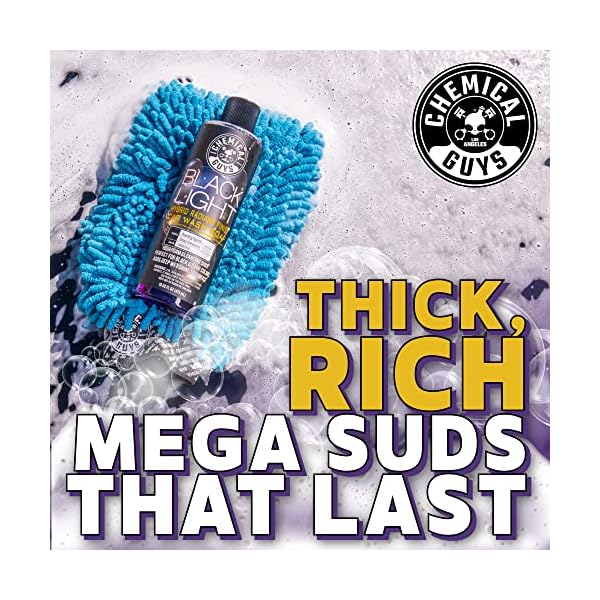 Black Light Car Wash Soap is the perfect shampoo for cleaning and enhancing black and dark colored vehicles. The advanced auto wash takes shine to new levels of depth and clarity. Black Light Car Wash Soap produces thick, slick, and rich foam that lasts through an entire car wash. The super high suds wash safely removes dirt, grime, and road film for a brilliant shine. Black Light Car Wash Soap is clear coat safe and will not strip wax or sealant. Gloss technology agents enhance a deep lustrous shine on black and dark color paint finishes. Use Black Light Car Wash Soap in any foam gun or foam cannon for added soapy suds along with the traditional two bucket car wash method. When used in a foam cannon, Black Light Soap produces thick foamy suds that cling to automotive surfaces and help release dirt and grime for a gentle scratch-free wash.