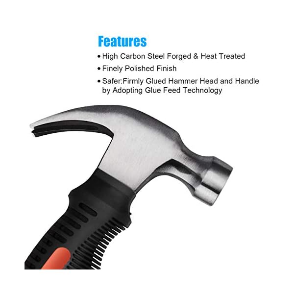 🔨【Excellent Performance】Driving and pulling nails. The narrow, flat side of the hammerhead concentrates all force in a small area, generating maximum striking strength. While the sharpened and curved claw ends generate maximum nail-pulling leverage by using the lever principle.