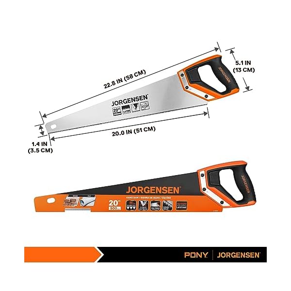【Ergonomic Handle】JORGENSEN 20” universal hand saw with a non-slip ABS+TPE soft grip, effectively adds comfort for prolonged work. In addition, the size of the handle is ergonomically designed to relieve hand fatigue during use. Both sides of the handle have 45° and 90° auxiliary angles to get the accurate cutting position.