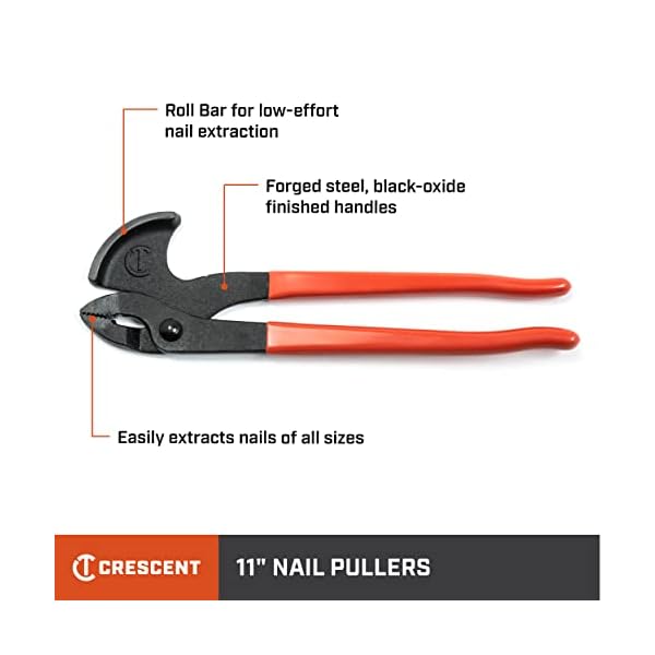 Tackle your next project with Crescent’s Code Red renovation and demolition tools, designed with input from industrial professionals as well as DIY enthusiasts. The Crescent NP11 11-inch nail pulling pliers are designed to pull finishing nails, floor staples, wire and coaxial staples, headed nails, brads, damaged fasteners, and pin nails. The dual handle make it quick and easy to grp, roll, and remove nails and staples. The durability of forged steel head and handles create a durable tool with rubber grips for comfort and control.