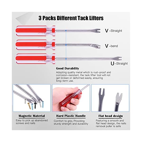 ♛【Tack Puller】: The 3pcs track puller tool are desinged with U tip and V tip, can meet your needs on different type of fasteners. Help you quickly remove deeply embedded staples in your furniture, upholstery, wood, floor, industry, tire nails, nail shoes, carpentry nails, etc.