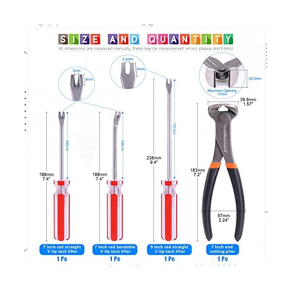 Set include: 7” end cutting plier, 4” bendable U tip tack puller, 4” V tip tack puller, 6” U tip tack lifter.