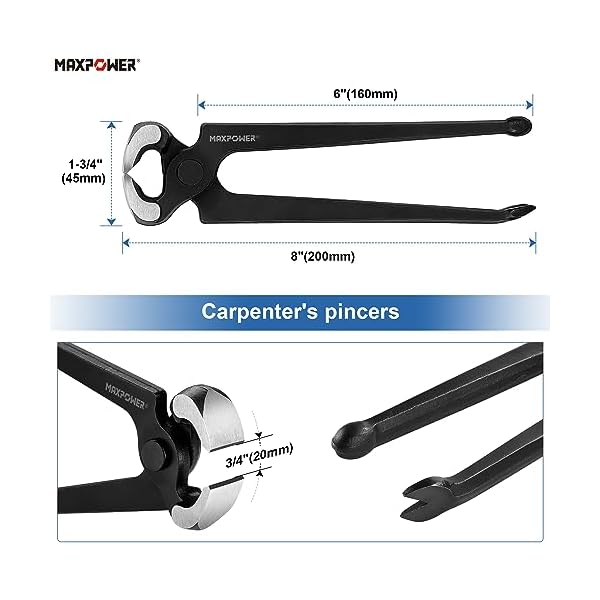 8 inch Carpenter’s Pincers, max jaw capacity 3/4″, for removing nails from wood without damaging the surface, a handy tool for pinching, cutting, and pulling objects