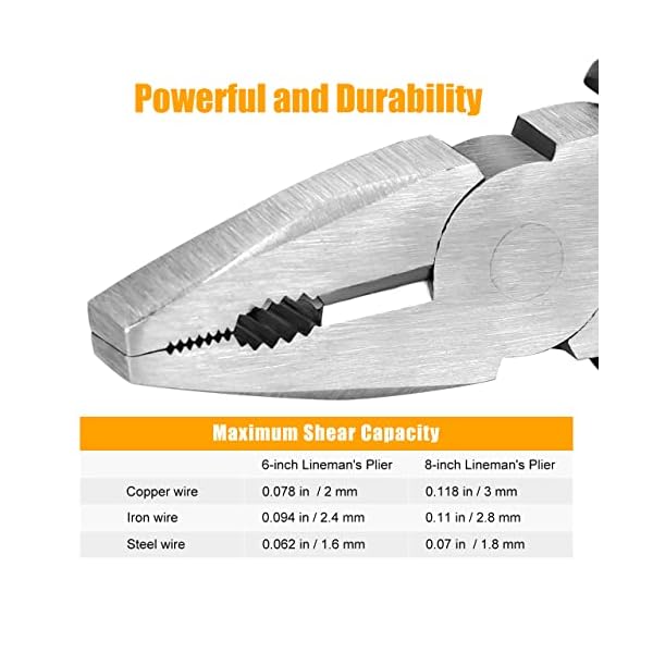 ✅【Strong Cutting Force】The cutting edge hardness of HRC60-62 degrees, shear hardness of HRC48-49 degrees, can easily cut single strand; The end of the line pliers is neat and well closed, and the head of lineman’s pliers is thick, which is not easy to misposition and deformation when used