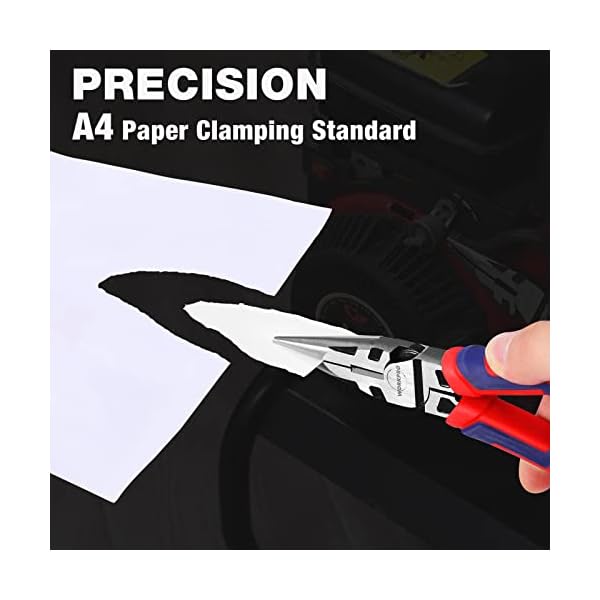 【Heavy-Duty & Rust-Protection】 These long nose pliers are made of heavy-duty chrome vanadium steel and processed with 5 boost crafts to improve their hardness and durability. Heat-treated hardness 40-48 HRC, high-frequency treated hardness 55-65 HRC. (find more in A+ content below)