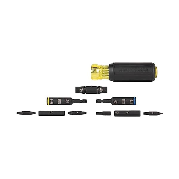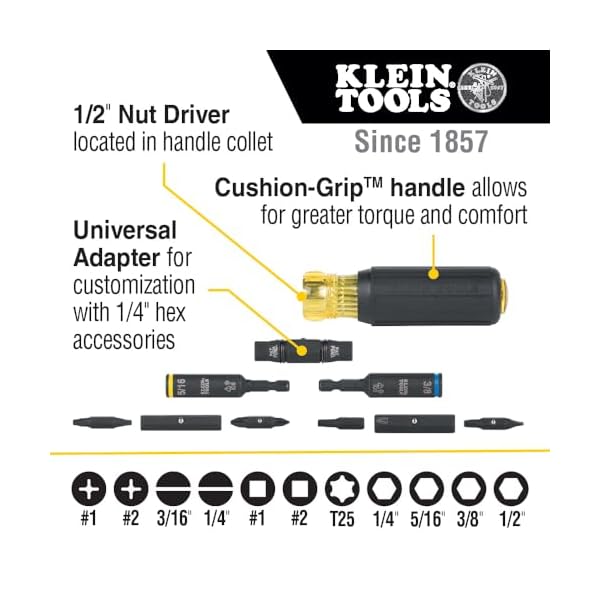 This impact rated multi-tool brings a new-to-world design to a classic 11-in-1 screwdriver. Each component is compatible with an impact driver, as well as the included screwdriver handle, eliminating the need to carry separate power tool accessories. The tool houses 7 popular tips and converts to 4 nut driver sizes. It’s the familiar feel of a multi-bit screwdriver, with the added utility to complete any job. For more than 160 years, Klein Tools has manufactured premium-quality, professional-grade hand tools that deliver the performance, durability and precision needed to get the job done right. Our family of engineers, workers and craftsman continue to put six generations of expertise into every tool we create by using only the highest quality materials, superior workmanship, and keeping manufacturing as close to home as we can. Klein isn’t just the name of our company, it’s also our family name. And since we’re an American company that’s family-owned and family-run, you know you can count on us to be here tomorrow. Klein Tools doesn’t just make great products, we make great products that stand up to the demands of the professionals who use them every day … Since 1857.
