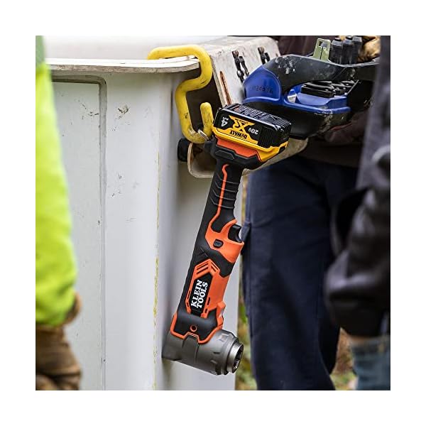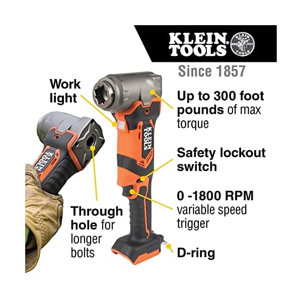 Engineered and designed by Klein Tools in the USA, the patent pending design of the 90-Degree Impact Wrench provides a better, more ergonomic way to fasten in the field. The right angle on this tool allows the user to reach around a utility pole easier for better access with less fatigue. Up to 300 ft-lb of max torque for driving fasteners into wood, metal and concrete. It features a variable speed trigger and a variety of square drives (1-1/8-Inch, 1-Inch, 13/16-Inch and 3/4-Inch).
