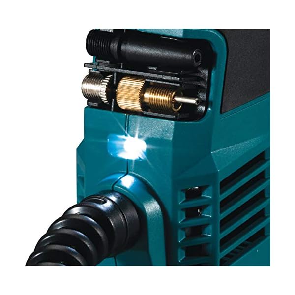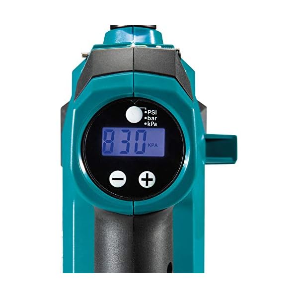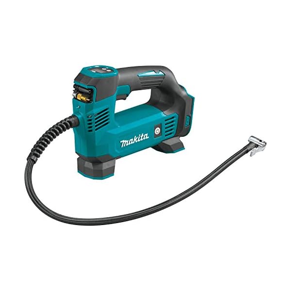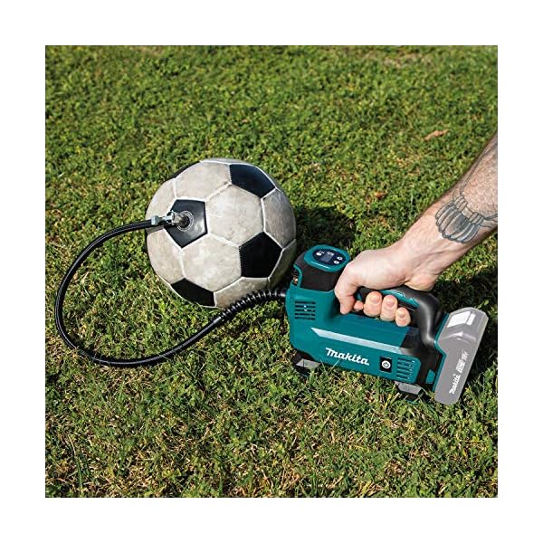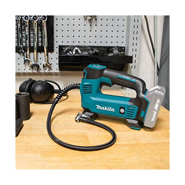 Inflate car tires, bike tires, or sports balls quickly with the 18V LXT Cordless Inflator. The Makita-built motor delivers up to 120 PSI. The tool features a high visibility pressure gauge display with backlight, LED light, and an auto-stop function when the desired pressure is reached. A 25-1/2” hose length provides better reach. The compact design allows for easy portability and convenient storage. It’s part of Makita’s expanding 18V LXT System, the world’s largest cordless tool system powered by 18V lithium-ion slide-style batteries. Makita 18V LXT Lithium-Ion Batteries have the fastest charge times in their categories, so they spend more time working and less time sitting on the charger. For improved tool performance and extended battery life, Makita created Star Protection Computer Controls . Star Protection is communication technology that allows the Star Protection-equipped tool and battery to exchange data in real time and monitor conditions during use to protect against overloading, over-discharging and overheating. For increased versatility, the tool can also be powered by Makita 18V LXT Lithium-Ion Batteries with the star symbol on the battery indicating Star Protection inside.