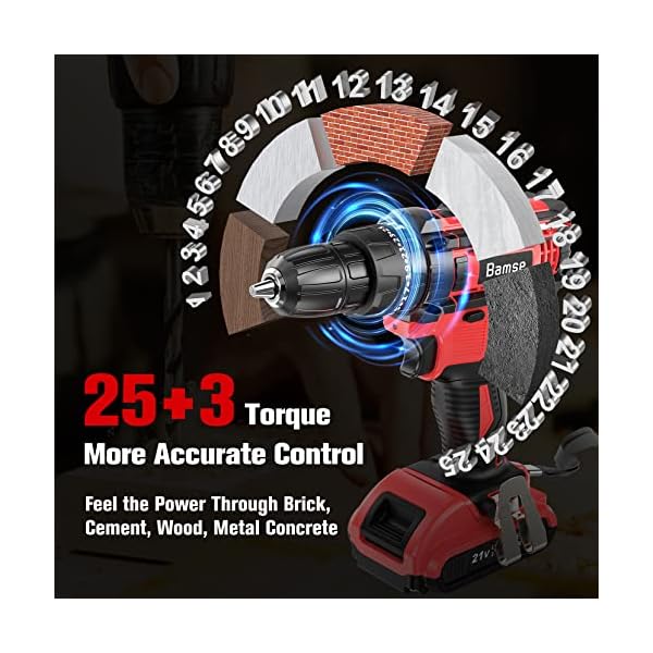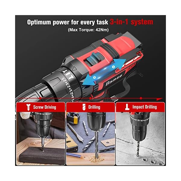 【3-in-1 System Hammer Drill & 42N.m Max Torque】Bamse cordless drill has 3 working modes: screwing, drilling and hammer drilling. The hammer function, which can greatly increase your work efficiency. With 372 In-lbs Max torque, the electric drill can easily meet a wide range needs of drilling holes and driving screws on wood, metal and plastic.