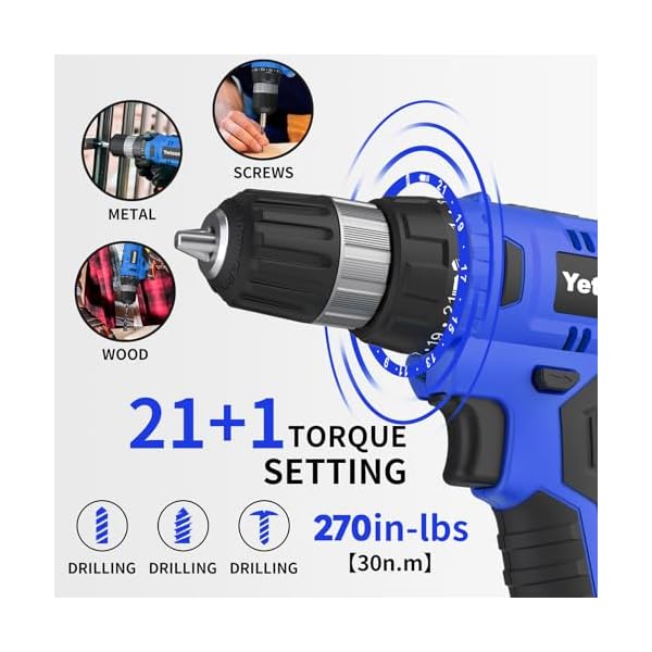 【 Configuration and Performance 】21+1 torque settings ( 0-650 RPM ) of power drill can provide more precise torque or speed adjustment as required,When the set torque is reached, the electric drill automatically idles, and the screwdriver stops rotating to protect the screws and force bearing objects.