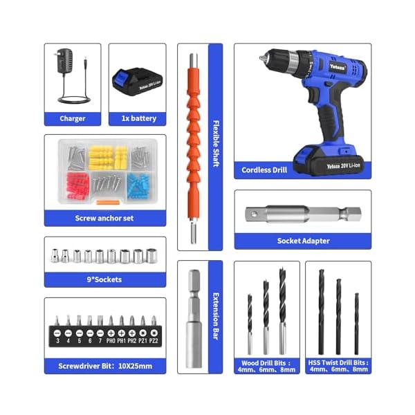 【 Place an order and you’ll get it 】You will get:1 x Cordless Drill ,1 x Charger,1 x Magnetic Flexible Shaft, 1 x Extension Bar for Sticking on Fastener,3 x Wood Drill Bits, 3 x Masonry drill bits,10 x25mm screwdriver bits,1 x Screw anchor set. Included 20V max Lithium battery with high performance cells provides ample runtime and increased performance