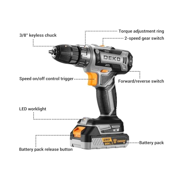 【Drill with Drill Bits】This drill set include 1*20V Cordless Drill; 1*1.5AH Battery; 1*Charger; 10*Bits(SL3-SL4-SL5-SL6-SL7-PHO-PH1-PH2-PH2); 1*Magneitc Bits Holder(60mm); 10*Screwdriver Bits; 6*Tipped Brad Point Drill Bits; 4*Nut Drivers; 1*User Manual