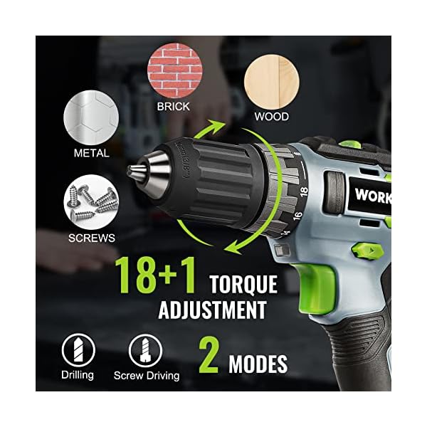 18+1 Adjustment Torque – This cordless drill delivers 220 in-lbs (25 N.m) of max torque and allows you to choose between two-speed settings (0 – 360 RPM or 0 – 1,300 RPM), so you will always have the power you need. Features 18+1 torque position clutch, which provides more precision of torque adjustment as needed