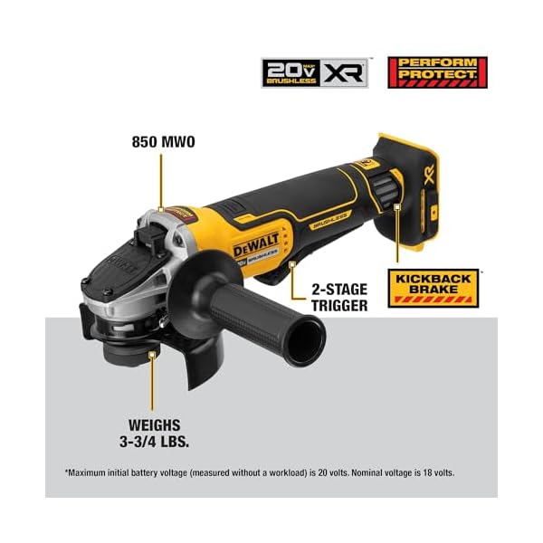 This brushless small cordless angle grinder requires no time changing brushes, and offers a longer motor life. DEWALT cordless grinder offers a high level of protection. Its break stops the wheel in 2 seconds or less. The Kickback Break engages maximum force to stop the wheel when there is a pinch, stall, or bind-up to reduce kickback. The grinder will also shut off in those events to further protect the user. Battery and charger are sold separately.