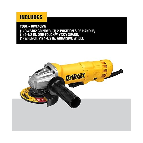 The DWE402 4-1/2-inch (115mm) Small Angle Hand Grinder features three powerful systems for maximizing performance such as the Dust Ejection System for preventing damaging dust from entering the grinder tool, One-Touch Guard for 360-degree rotation, and Quick-Change Wheel Release for easy wheel removal.