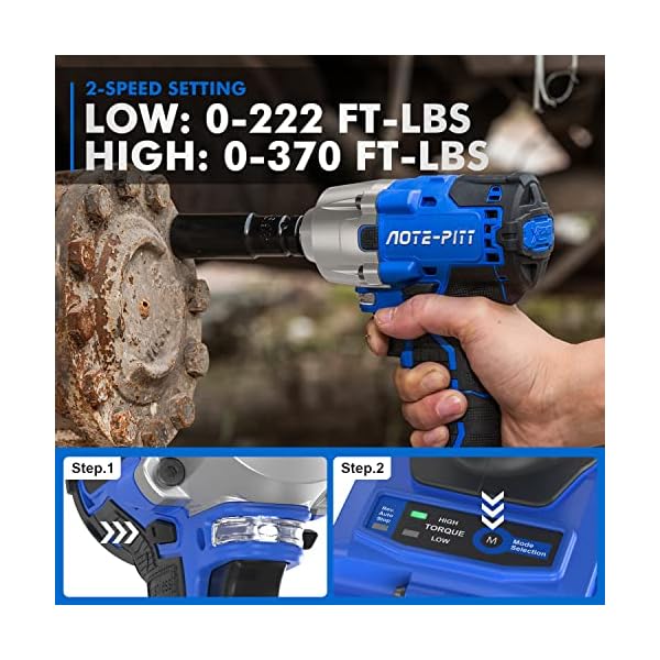 【High Torque and Brushless】 AOTE-PITT 20V cordless impact wrench is compact, offers 2 selections of torque output, Max 370 ft-lbs. (500N.m) at high setting, which has enough power to break off stubborn fasteners, rusty nuts, removing tires from cars or truck. Switch it to lower torque setting for automotive repairs, motorcycles or major construction projects, bolts, product assembly or other heavy-duty maintenance. The brushless motor keeps this impact gun a consistent power and longer life.