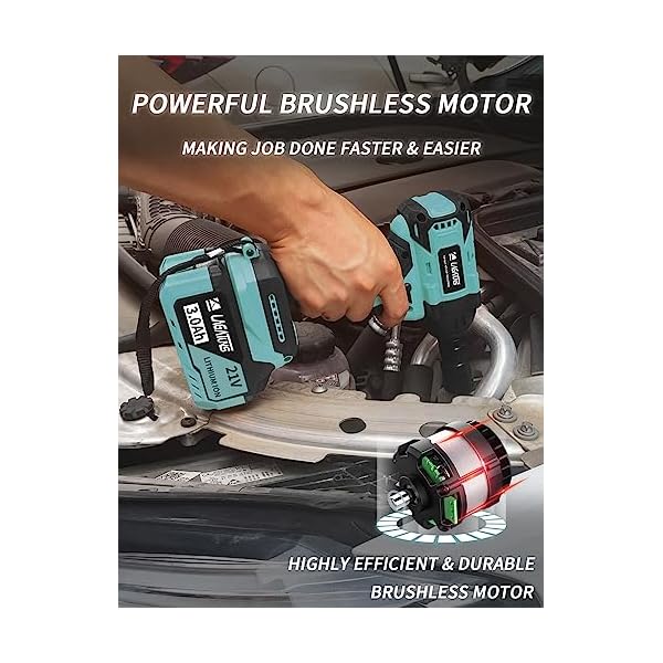 1.【Strong Power and Versatile Applications】: With a performance motor, Our Cordless Impact Wrench 405ft·lbs max torque and max 3600rpm speed, allows you to tighten or loosen various nuts and bolts easily. Suitable for unloading tires from car, and car repairs, large construction projects,.But please note that use it within the torque range. For some special scenes such as the screws of large trucks, which require greater torque, our electric wrenches will no longer be applicable at this time.