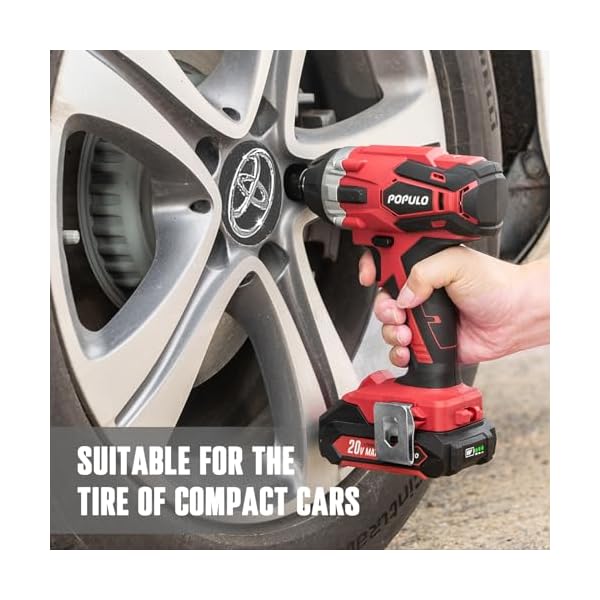 Efficient Automotive Maintenance Solution:The Populo 20V Cordless Impact Wrench socket Set is the ideal tool specifically designed for small vehicles.Equipped with a powerful 1/2 inch square drive and an adjustable speed trigger,it offers up to 3098 inch-pounds of torque,making tires replacement tasks a breeze.However,it’s best to avoid using this device for heavy-duty vehicle tire changes to ensure the safety of the operator and optimal tool performance.