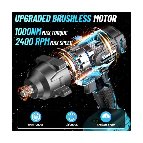 【A BEAST FOR VERSATILE APPLICATIONS】Ideal for Heavy-Duty Machinery. With a maximum torque of 1000 N.m / 738 FT-LB and 2400 RPM, Seesii 1/2 impact gun is specifically designed for heavy-duty jobs,this electric impact gun 1/2 drive can efficiently perform heavy equipment maintenance, major construction projects, agriculture machinery, pick-up trucks, rusted nuts & bolts, truck rv automotive repairs, etc.