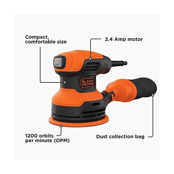 The BLACK+DECKER 5″ Random Orbit Sander is perfect for anything from removing paints and varnishes, to giving your project a smooth finish. With a compact design and a 3 position grip, the Sander fits those hard to reach spots with ease. Its powerful 2.4 amp motor delivers 12,000 random orbits per minute, for a swirl-free finish. An assortment of common sandpaper is included. And when you’re done, the built-in high-performance dust collection bag makes clean-up a breeze. Furniture rehab and DIY projects have never been this easy. BLACK+DECKER curates tools for the DIYer and home improvement enthusiast. Make home, garden, or DIY projects fun again with easy-to-use power tools and efficient devices to tackle jobs of all sizes. Home, garden, and yard maintenance have never been this effortless.