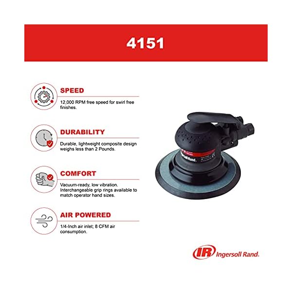 Ingersoll Rand’s 4151 ultra-duty, 6-inch, vacuum-ready, random orbit pneumatic sander is a low-vibration model that produces an ultra-high-quality finish and connects to central or portable vacuum systems. Whether leveling the top of a wood table or stripping away paint from a piece of metal, the 4151 sander offers reliable and steady execution that increases efficiency while helping to create superior finishes.