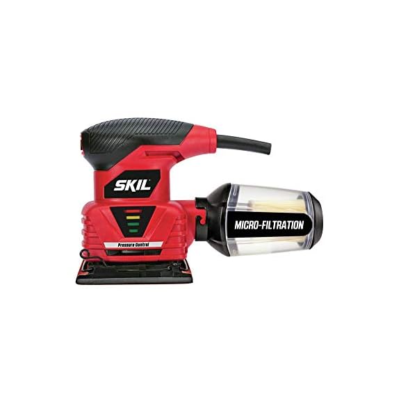 The SKIL Sheet Palm Sander is the perfect tool for faster stock removal and smooth results when you’re putting the finishing touch on your project. The pressure control indicator lets you know when the right amount of pressure is applied and warns you when there’s too much. The pad brake eliminates gouging. Micro-filtration captures and contains fine dust particles to keep your work surface cleaner. A sealed switch keeps dust out of the tool for a long life. The dust canister is clear, removing the guess work of figuring out when to empty it. ork of figuring out when to empty it.
