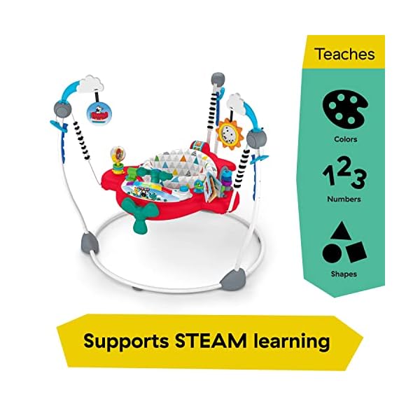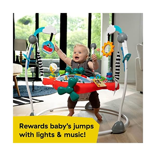 The Baby Einstein Ocean Explorers Airplane Adventure Jumper is a baby-activated, airplane-themed activity jumper that rewards baby’s jumps with lights and music to develop gross motor skills.