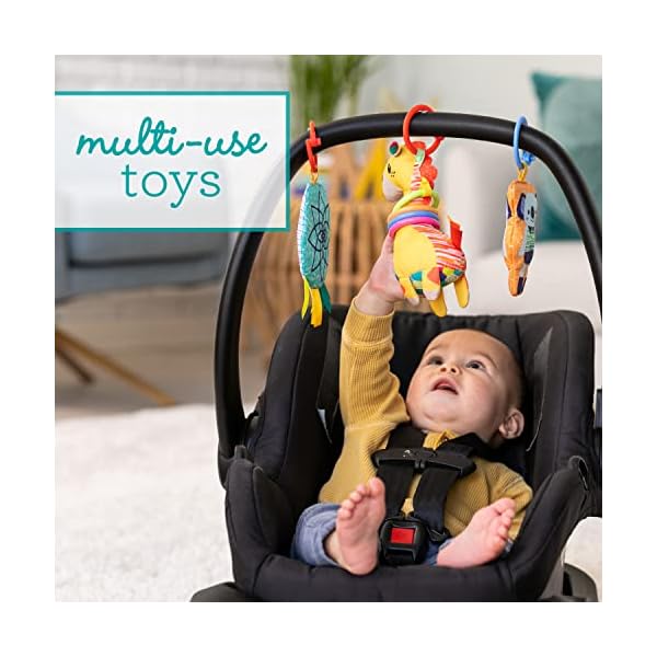 BABY MUST HAVES: Multi-use must-haves support and encourage developmental skills like fine motor, tummy time, eye-coordination, mouthing, and auditory skills; the linkable toys can also be attached to stroller bars for extended play.