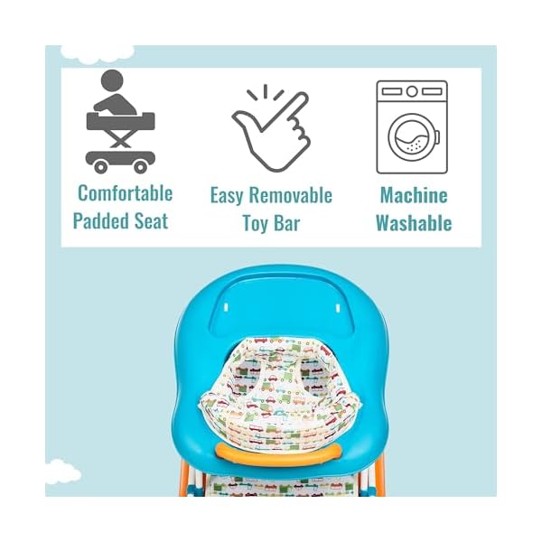 Help your baby discover walking with the Go Getter Walker. The seated walker is a great way to introduce your child to walking. As your LO gets confident, use it as a walk-behind walker – see them push it around the house! The Go Getter comes with attractive touches that your child will delight in. The bright multi-functional toy tray provides non-stop entertainment. It also comes with a removable snack tray for meals on the go! Your child will delight in the 3 attractive colors and trendy patterns that the Go Getter is available in. Other useful features include a comfortable high foam seat back which provides added support. The seat pad is conveniently machine-washable. The Go Getter features three height settings to keep pace with those growing strides It conforms to ASTM F977 Safety Standards. The independent front swivel wheels allow easy maneuvering and skid-resistant friction pads on base provide added safety. Use the removable fabric footrest when stationary. Product specs are 27L x 25 W x 16 H inches and it weighs 10.2lbs Wipe plastic parts with a damp cloth to clean.