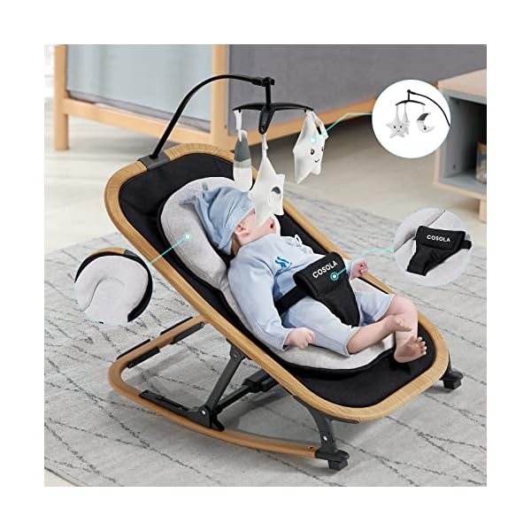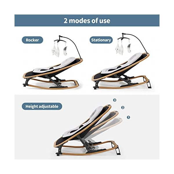 【3 position of recline & 2 Modes】COSOLA infant bouncer offers your little one 3 positions of recline to optimize their comfort level and you can adjust it effortless. Even on the top position, the bouncer still bounce gently, make your baby calm and relaxed. Also, it’s easy to adjust from stationary to rocking, meet your different needs.