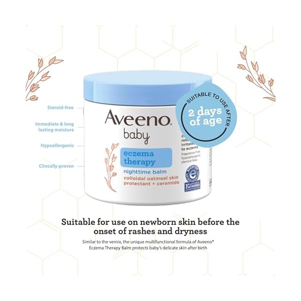 11-ounces of Aveeno Baby Eczema Therapy Nighttime Relief Balm to help soothe baby’s dry, itchy & sensitive skin. An independent clinical has shown Aveeno Baby Eczema Therapy Balm is suitable to use on newborn’s skin as early as the second day of life, before the onset of rashes and dryness