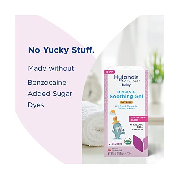Hyland’s Naturals Baby – Organic Daytime Soothing Gel, 0.53 ounce. Wash hands before use and cut open tip of tube on score mark. Apply pea-sized amount of gel to your clean fingertip or cotton applicator. Gently massage the gel into baby’s gums as frequently as needed. Store tube in refrigerator for additional cooling sensation. Do not freeze. Use product within 90 days of opening. Use only as directed. Keep out of reach of children. Do not use on babies less than 2 months of age. Do not use if your child has any known allergies to the ingredients. Do not use if tube tip is cut prior to opening. If irritation continues, consult your pediatrician.