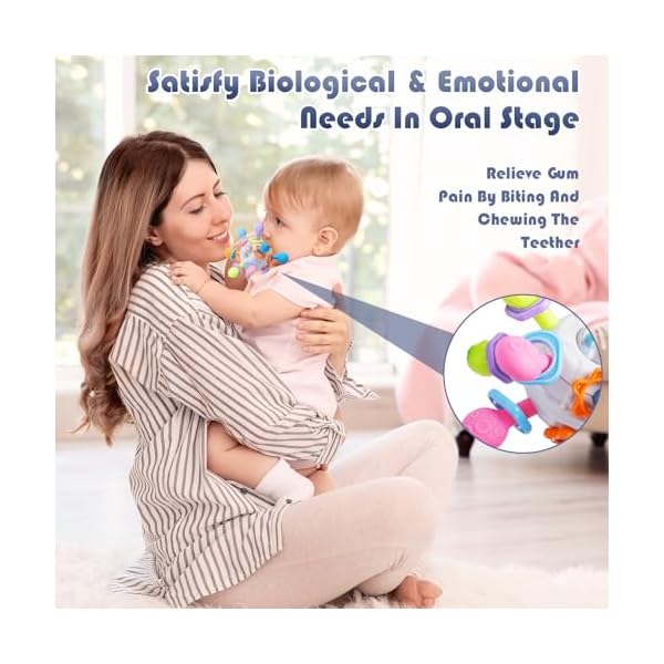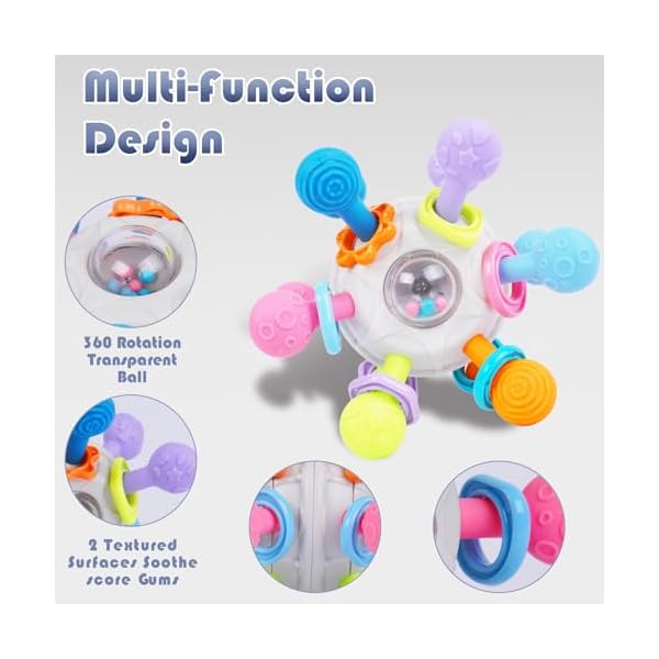 Size for Baby Little Hands:360 degree rotation,exercises finger flexibility.Multi-sensory grip rattle and teether encourage grasping and reaching, soft and textured design for babies to develop tactile senses and clutching skills while having fun montessori toys.