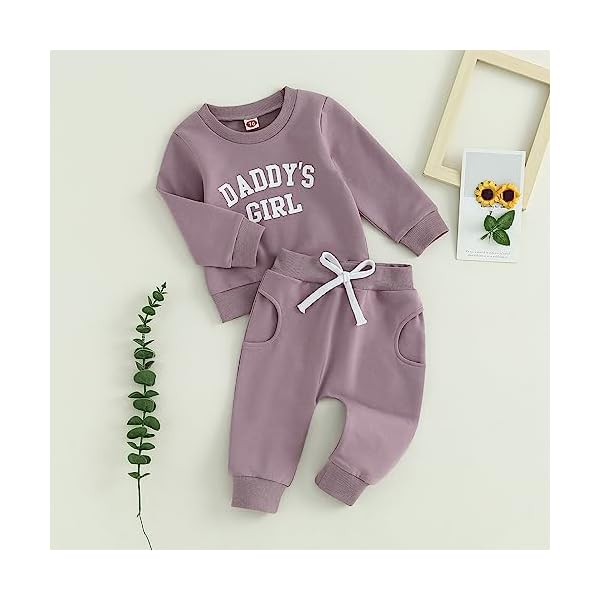 MATERIAL: This baby girl clothes 2 piece outfits is made of premium 70% cotton, 22% polyester, 8% spandex material. Soft, breathable and skin-friendly, harmless to your little girl’s tender skin. Cute casual clothing. DESIGN: This toddler baby girl cute clothes, long sleeve, solid color, crew neck, daddy’s girl letters printed, oversized pullover shirt top, comes with a pair of elastic waist slouch sweatpants which have 2 pockets. This baby girl fall winter outfit is fashionable and lovely. make your baby more attractive.