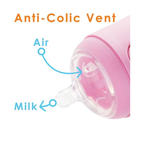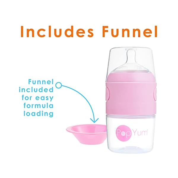 ✅ INCLUDES: Two Pastel Pink 5oz. PopYum baby bottles (150 ml) with #1 slow flow anti-colic nipples and a funnel which makes loading formula a breeze and stops formula from falling into the water chamber.