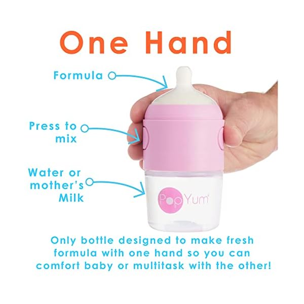 ✅ ONE HAND ONLY: PopYum stores formula and water separately in the bottle. When hunger calls, simply press the buttons (or ‘Pop’), shake a few times, and ‘Yum’! PopYum is the only bottle which was designed to be used with one hand only so you can comfort baby or multitask with your other hand.
