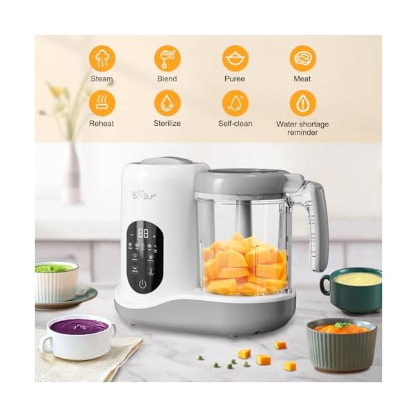 💖【Healthy & Safe】Baby food steamer and blender passed FDA/UL certification. Blender cup made from Tritan material. BPA/lead/phthalates/odor/latex/petroleum free. Its water shortage reminder function will remind you when baby steamer is low on water. 👉NOTE: Baby food maker has a safety lock design, it can only be powered on when the blender cup lid installed in place with the blender cup. Meanwhile, the blender cup should be installed in place with the base. Please use it with 120V voltage.