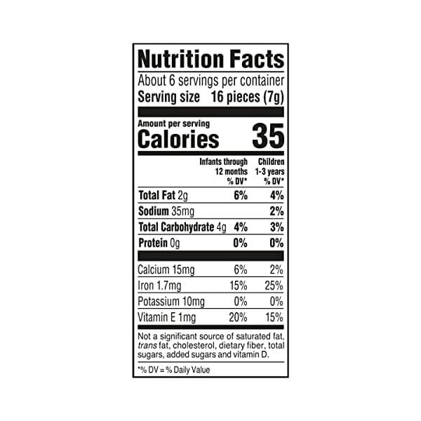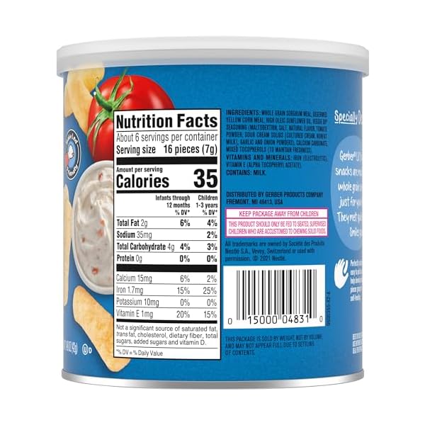 Make every little bite count with a snack designed just for your older baby with Gerber Lil Crunchies Veggie Dip Baked Corn Baby Snacks. These Gerber baby snacks come in a delicious veggie dip flavor for new taste combinations your little one can experience. Each serving of non-GMO baked snacks is made with 5 grams of whole grains and 20% daily value of vitamin E. They never contain any artificial flavors or artificial colors. These Gerber snacks have a meltable texture that dissolves easily and is easy to chew and swallow. Perfectly sized for older babies learning to pick things up, these baby food snacks are an ideal finger food for teaching crawlers to self-feed. Serve these snacks to seated, supervised babies who are used to chewing solid foods. Use within five days of removing the seal from this reclosable container for optimal freshness.
