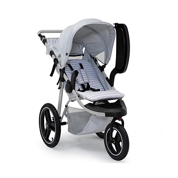 SMOOTH RIDE: 16-inch back wheels with suspension, 12-inch puncture-proof front wheel with swivel lock | Rear brake | Adjustable leatherette handle with safety tether | Swing away child tray for easy loading | Quick release back tires for compact fold