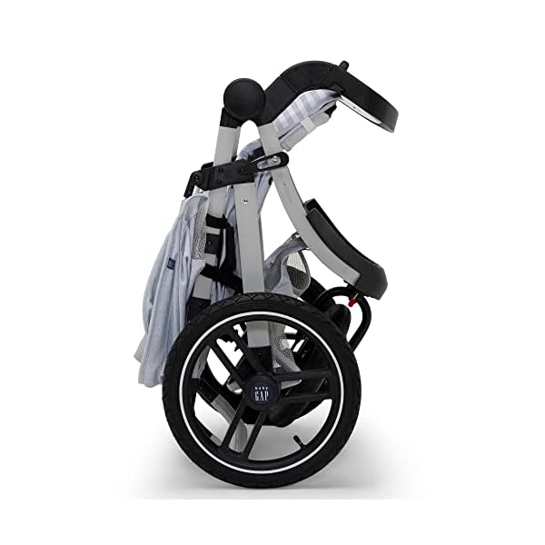 Explore all life has to offer with the babyGap Trek Jogging Stroller! Designed for the future in every possible way, this jogger features fabric made from recycled water bottles. Plastic drinking bottles are sorted, cleaned and shredded into flakes that become the yarn the seat fabric is made from. A great choice for your child and the planet, this versatile jogging stroller is built to handle rugged running trails or smooth city streets. Its durable frame is outfitted with a front swivel wheel, airless puncture-proof tires and an extendable, soft knit canopy with sun visor and peek-a-boo window, and it comes with a safety tether to attach to your wrist when jogging/running. Incredibly comfortable, this stroller has a 5-point safety harness with cushioned shoulder pads, reclining seat, convenient child tray, leatherette handlebars and tons of storage. A spacious storage basket and removable parent organizer ensures you have enough space for all your essentials. For easy storage or travel, quick release back wheels allow for compact folding. Recommended for infants up to 50 pounds.