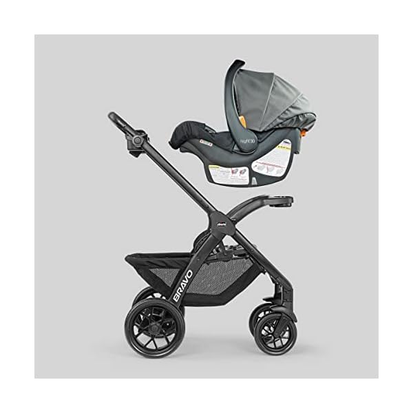 Removable seat and canopy transform Bravo LE ClearTex to a lightweight car seat carrier for streamlined travel from day one. Offers secure, click-in attachment for all Chicco infant car seats (sold separately) via the child tray – no adapter needed.
