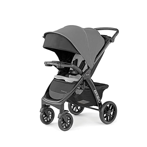 The Bravo LE Stroller showcases large, sleek wheels with treaded tires and all-wheel suspension to navigate uneven terrain. Rear-linked foot brakes secure the stroller with a simple tap, allowing you to retrieve items stowed in the large basket or from one of two organizer pockets. The one-hand smart-fold with auto-swivel wheels allows the stroller to stand upright without the parent handle touching the ground, while the child tray neatly folds down for more compact storage.