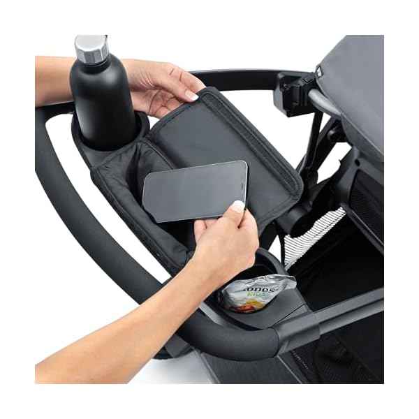 In addition to the extra-large stroller basket with front and rear access, the included Shopping Basket component can be mounted in the upper position while the Infant Car Seat Adapter/Basket provides even more storage options when used without an infant car seat. The toddler seat also features a mesh storage pocket on the back of the seat. The parent tray includes two large cup holders and a covered storage compartment.