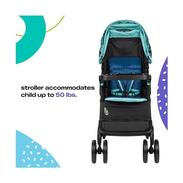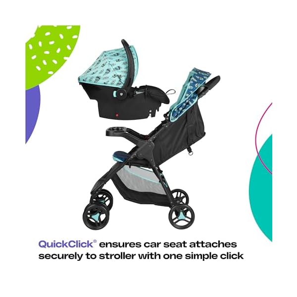 More Convenience for You The Cosco Kids Lift and Stroll DX Travel System makes it easier than ever to get around. With the strollers lightweight frame and large wheels, its simple to maneuver wherever you go. And when its time to head on home, the stroller folds in less than a second with a simple lift of the fold strap. Parent Friendly Features The large basket is perfect for all those accessories youll need along the way. The handy parent tray has two cup holders, along with a convenient storage tray that lets you keep your phone easily within reach. And theres a tray with a cup holder for your little one, too. Light n Comfy Rear-Facing Infant Car Seat The included car seat has a variety of safety features to put your mind at ease. Its fully equipped with Side Impact Protection and has four harness heights. The 5-point harness fit adjusts easily from the front. This all adds up to a safer ride and a better fit as baby grows. Smart Shade Both the stroller and car seat have stylish lined canopies for plenty of sun protection. And the stroller canopy includes a peek-a-boo window and sun visor. Easy to Installand Clean The car seat features QuickClick and attaches to the stroller or the stay-in-car base in just one click. So its a breeze to move from the car to wherever you need to be. And when your little one makes a mess, youll be glad to know that the car seat pad is machine washable, too.