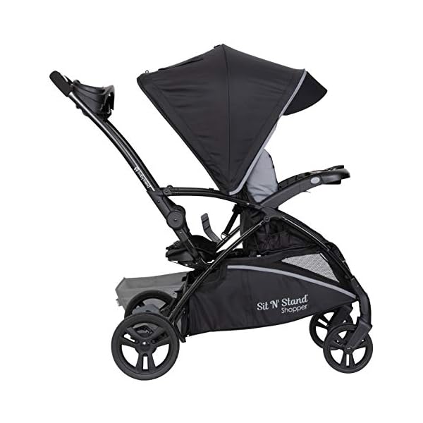 The Baby Trend® Sit N’ Stand® 5-in-1 Shopper Stroller is perfect for your growing family. With the new compact and streamlined frame, our Sit N’ Stand® 5-in-1 Shopper Stroller has 5 modes of use – travel system mode, car seat in the front seat and older child standing on platform, child in the stroller seat only, child in the stroller seat with sibling sitting on bench, and child in the stroller seat with sibling standing. The front and back seats can hold kids up to 50lbs each. Strolling with our Sit N’ Stand® Shopper Stroller will be a breeze for you and your little ones. Your children will appreciate Comfort Cabin, which includes removable extra-long canopy with UPF 50+ protection, multi-position reclining seat, deluxe fabrics and premium padding that will keep them safe and comfy, staying away from the harmful sun rays. Parents will love our Parent Premiums that have a modern parent console with multi-directional cell phone positioner and extra-deep cup holders. Mom and dad now can easily access the large storage basket in the front and back. With the innovative MagneTec™ Basket, parents can open and close the basket very quickly with the help of strong magnets to hold the basket closed. This practical extra-large basket can be extended and hold up to 30lbs of parents’ essentials – groceries, toys, diaper bags, etc.