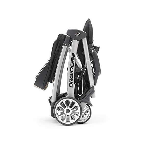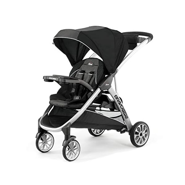 For younger children, The Chicco BravoFor2 standing/sitting double stroller features a traditional padded stroller seat, five-point harness, large adjustable canopy, and removable tray with two cup holders. For infants, The stroller seat folds forward to accept a Chicco Key Fit or Fit2 infant car seat with easy click-in attachment. (Sold separately)for older siblings, the BravoFor2 is outfitted with a bonus back seat and platform where big kids can choose to sit or stand. The seat folds away easily When unoccupied and includes a three-point harness for security. Easy-grip handles provide added stability for standing and a backrest gives extra support.The BravoFor2 is designed with a one-hand, ultra-compact quick fold for easier maneuvering and storage. An integrated handle easily activates the fold and simultaneously rotates the front wheels inward to keep the folded unit standing. Once the stroller is closed, The fold handle also doubles as a carry handle. Treaded rubber tires, full suspension, and front swivels help maintain a smooth ride for both passengers in every configuration. One-touch brakes keep the stroller in place when parked. A padded push-handle, parent tray with two cup holders, and large storage basket with front and rear access provide added convenience for mom or dad.
